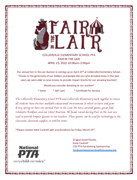 The Collierville Elementary School PTA works to assist our school in providing our children with quality educational opportunities. For this to be accomplished, the financial assistance of community members is essential to reach our goals. In order to achieve our fundraising goal, we need your help. Contributions from the Collierville business community have been a tremendous value to CES. We kindly ask for your assistance this year to help us meet the educational needs of our children. Any amount you are able to donate is very much appreciated. Help our school! Help your business!